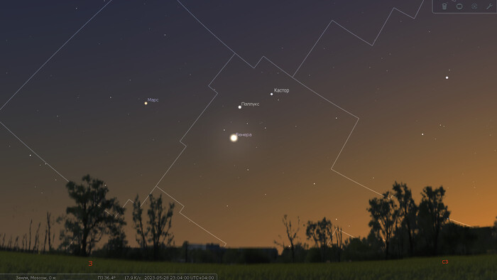 Венера вблизи звезд Кастор и Поллукс вечером 28 мая 2023 года