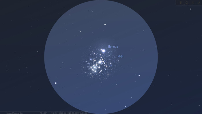12,13 и 14 июня Венера проходит по рассеянному звездному скоплению Ясли в созвездии Рака (известному также как M44). Наблюдать это явление лучше в южных широтах, где не наступает период белых ночей, и слабые звезды скопления Ясли будут хорошо видны в легкую оптику.