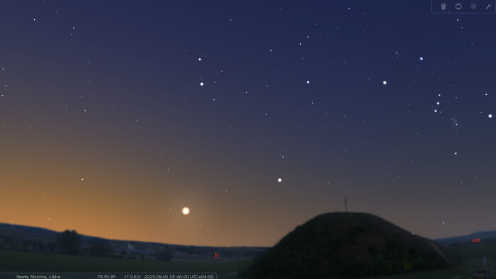 Первые дни утренней видимости Венеры в средних северных широтах.Иллюстрация на 1 сентября 2023 года