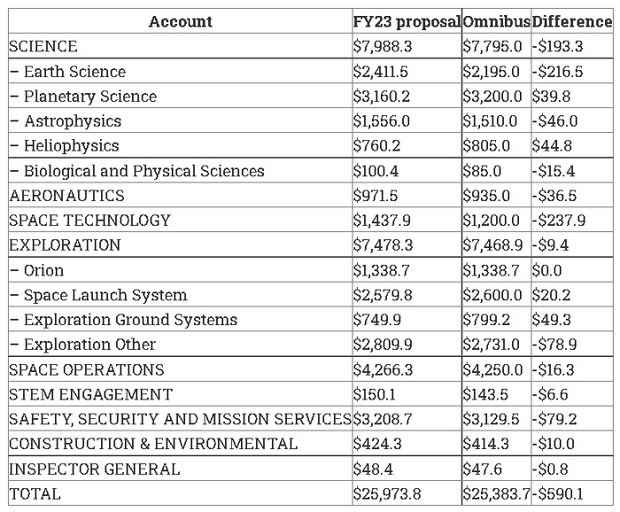Совокупный законопроект о расходах на 2023 финансовый год предоставит НАСА почти 25,4 миллиарда долларов, что более чем на 5% больше, чем в 2022 году, но меньше, чем запрашивало агентство.