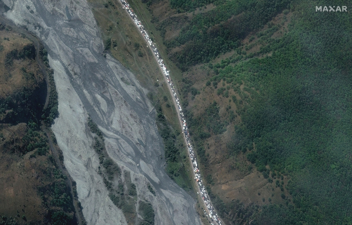 Спутниковое изображение Maxar Technologies, сделанное 27 сентября, вдоль границы Россия – Грузия и обширной (длиной ~16 км) пробки на подходе к пограничному пункту Верхний Ларс (широта/долгота: 42.768, 44.631), а также пограничный переход Ларс (широта/долгота: 42.740, 44.627).
