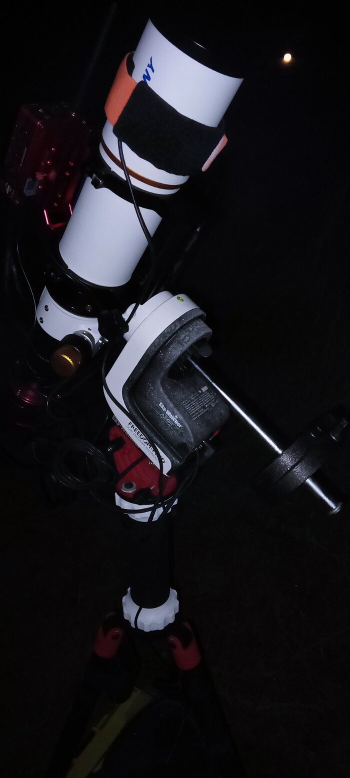 Внезапная осень не радует - ночью обещали до 3-х градусов тепла. Для предотвращения запотевания оптики на телескопе у меня есть грелка, а для гида пришлось напечатать бленду, благо есть 3D-принтер (помогло, всю ночь оптика гида была чистой).