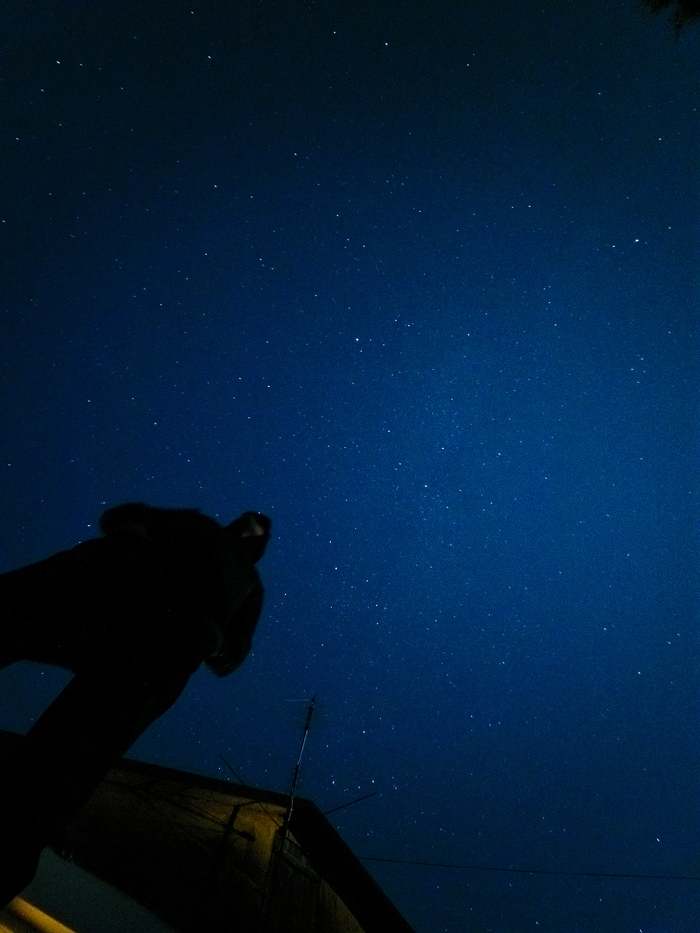 Большая медведица на северной стороне уже отчётливо видна ,хотя до полного заката ещё пару часов. Снизу можно заметить маленькую "медведицу". Кошка ,зовут Етти. Живет на 2 дома( зачем есть из одной миски когда можно из двух?)к нам прибегает часто когда мы гостим в Дубах.