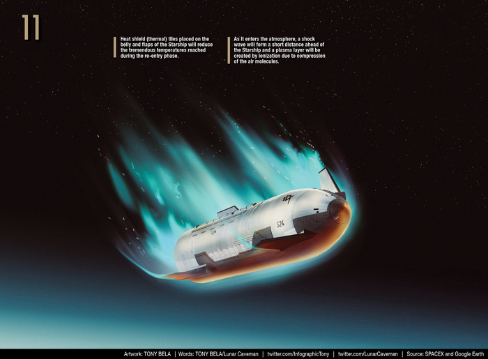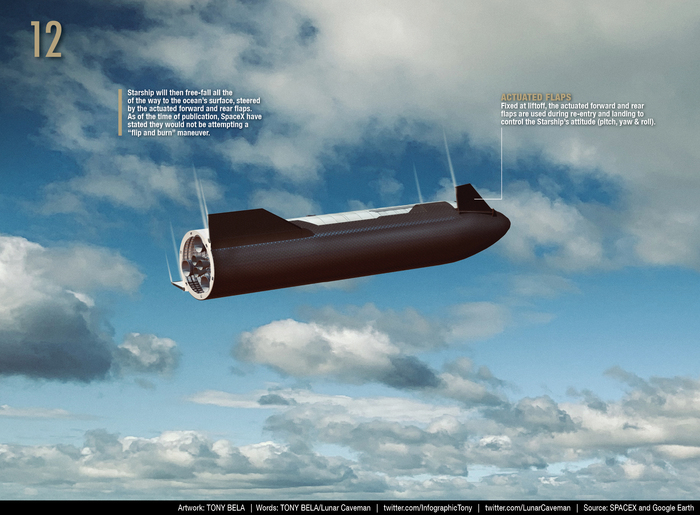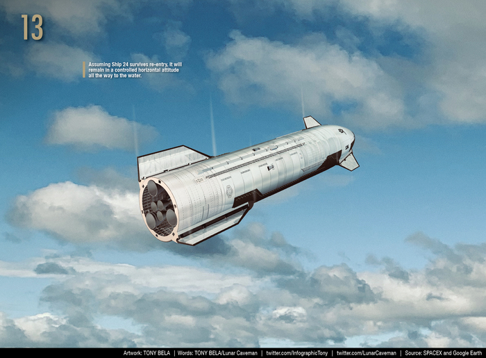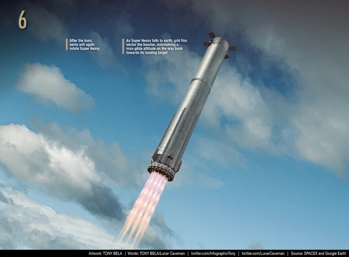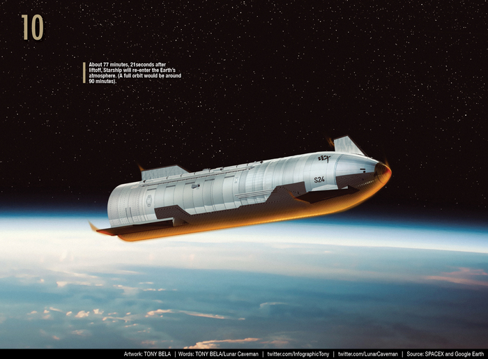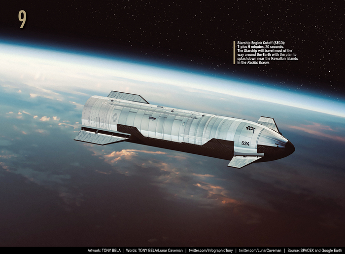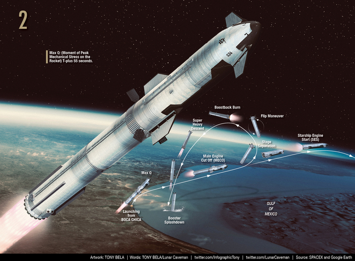 Инфографика от Тони Бела к первому тестовому старту Starship. Разбивка по этапам.