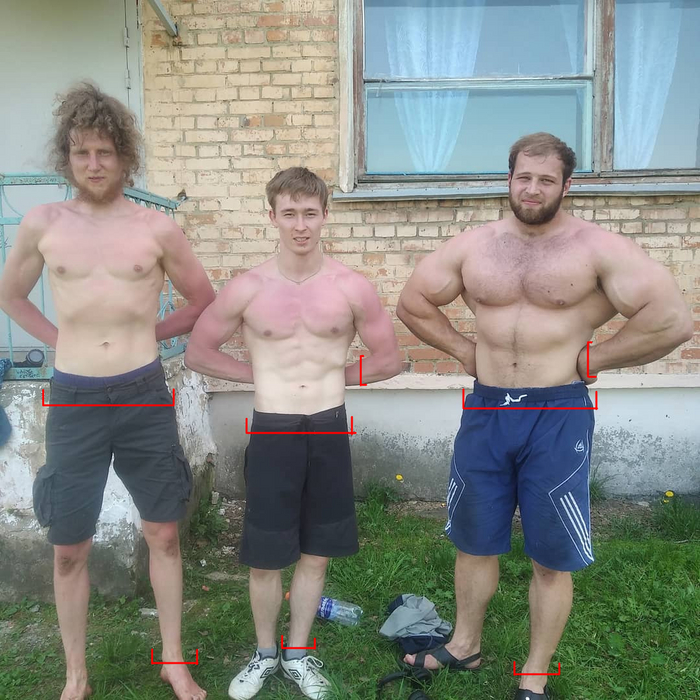 Абстрагируясь от количества мышц, смотрим на запястья и видим, что запястья (где мышц почти нет) у Андрея шире, чем предплечья (где мышц много) у одного из его компаньонов.