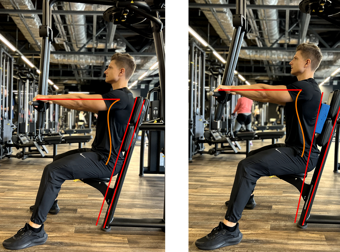 Взглянем на тренажер честпресс, который тоже, казалось бы, должен приводить к горизонтальному сгибанию плеча. Но опять же, тут есть наклон.
