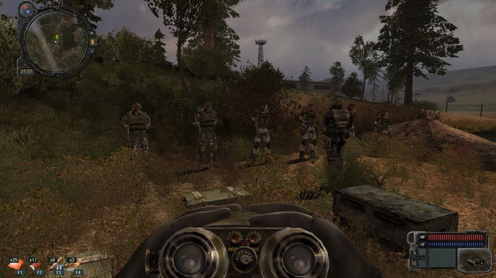 На подходе к какому-то строению меня окликнула группа подозрительных молодцов. Попросили найти им безопасное место. Дескать, темно, страшно, выбросы, и сталкеры убить могут.