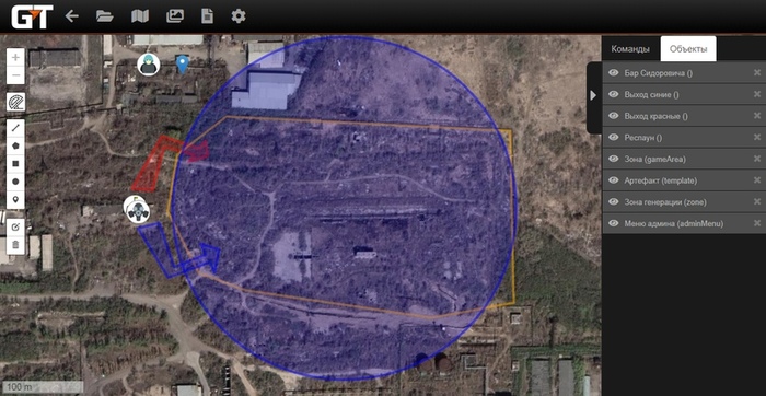 2.Установить зону генерации артефактов (id=zoneGen). Увы отредактировать текущую пока не выйдет, так как есть ошибка с изменением радиуса. Поэтому удаляем и рисуем новый круг описанный вокруг области Зоны. Объект будет скрыт после запуска игры.
