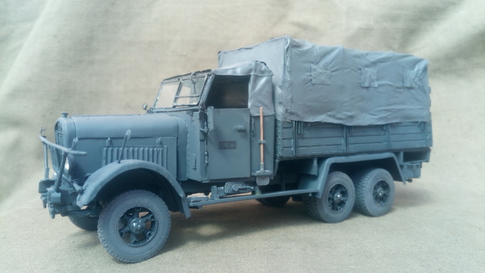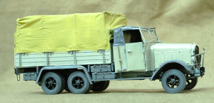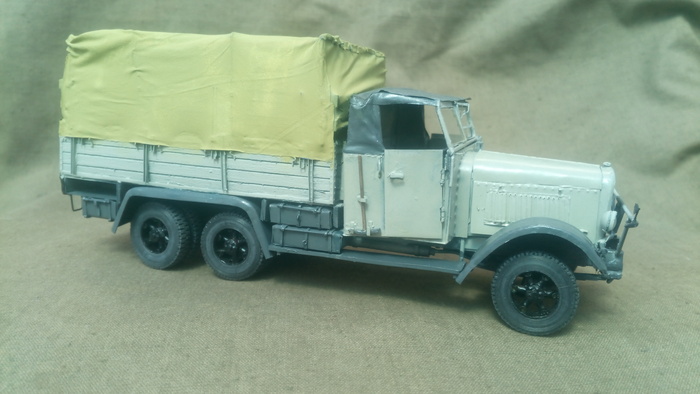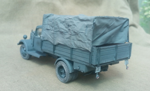 Ну и главная проблема набора видна на собранной на скотче кабине. Это плохая стыковка всей модели на финальной стадии. За один раз нужно состыковать нижнюю часть кабины, тент кабины, кузов, раму и сделать это так, чтобы передняя решетка радиатора не образовывала щель боковыми. Короче гемор с кучей прищепок, скотча и колдовства.