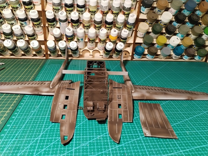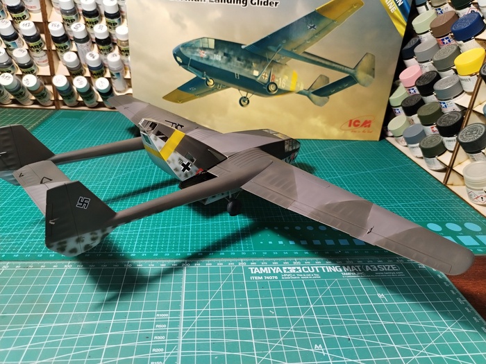 По фото будет не особо заметно, но модель окрашена в два разных серых цвета - gull grey - низ фюзеляжа и крыльев, ghost grey - сверху. Волнистое разделение делал пластилином.
