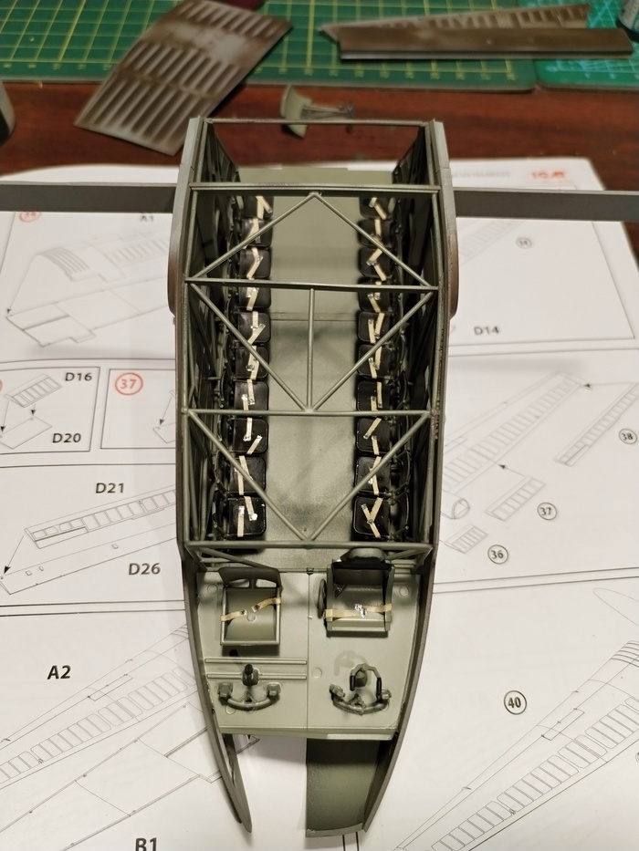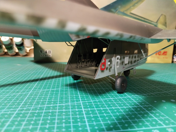 Больше всего времени было потрачено на сборку сидений для пассажиров ( десантников ) , но даже с учётом этого сборка с покраской отняла от силы 6 часов пока я не сделал ученическую ошибку , да при всем своем опыте маленькая ошибка может испортить всю модель . Так как производитель ни чего не пишет в инструкции о необходимости утяжелить переднюю часть и неимением там места для груза пришлось раскатать свинец 22 грамма в тонкий блин и приклеить его под полом кабины пилотов . Казалось бы что могло пойти не так ?))) Спешка и суперклей который из за большой площади высыхал медленно , а я уже успел застеклить кабину ... Которая естественно покрылась изнутри белым порошком и казалось бы ни чего страшного можно легко этот налет убрать , но я застеклил кабину капитально . Если бы использовал клерфикс то можно было бы легко снять после покраски стекла , вычистить их и приклеить обратно , но я использовал жидкий клей от тамии . Так что два дня я пытался изнутри через пассажирский салон отчистить , но получилось так себе .