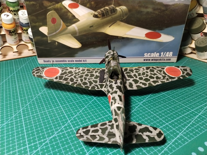 13. И наконец - расчалки! На этот раз я не стал гнаться за минимальной толщиной материала, и использовал многократно проверенную тонкую чёрную нить. Никаких рыболовных мононитей, которые хрен отрежешь скальпелем, никаких ниточек из тюли, которые склонны собираться в гармошку и не хотят красится. К тому же на фотографиях данной машины отчётливо видно, что расчалки, тяги и антенны вовсе не такие уж тонкие. В общем, цианоакрилат обычный и гель, игла, тонкий пинцет и день кропотливой работы - и верёвочки готовы. Вышло не идеально, всё равно не удалось натяжения, как у струны, но прогресс с прошлой работой очевиден. А я только учусь!