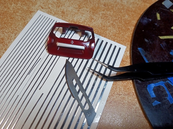 Отдельным пунктиком этой покраски для меня был значок Рено на задней двери. Тот, который был нарисован изначально, я закрасил, да и был он не слишком красив - чёрная краска... Элемент приметный, потому надо бы его сделать, а рисовать от руки, как на руле я не хотел - в любом случае вышло бы не очень. И тогда я вспомнил про хромированные полосочки-самоклейки из маникюрного магазина! Немного повозившись с пинцетом и скальпелем, я сделал весьма пристойный логотип Рено. Было бы намного хуже, если бы машинка был Пежо...