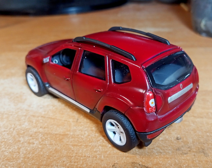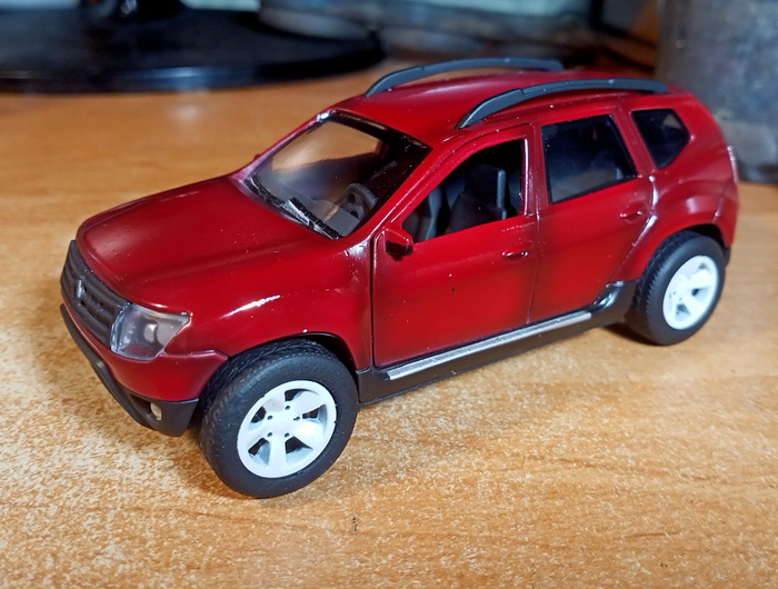 Приветствую, уважаемые подписчики, коллеги-моделисты и просто читатели! Закончена крайне нетипичная для меня работа на заказ - перекрас модели игрушечной машинки в масштабе 1/43. Не моя тематика, не мой масштаб. Ранее приходилось из подобного реставрировать советскую модель грузовика АМО Ф-15 в масштабе 1/24, собирать и красить модель трамвая КТМ-5 от AVD в 1/43 ну и окрашивать отдельно корпус подобной машинки Альфа Ромео в 1/43. Скажу честно - не считаю ни одну из тех работ особо удачными, тем не менее с такими просьбами ко мне изредка, но обращаются. В этот раз один мой знакомый (кстати, тыжпрограммист) захотел иметь игрушечную машинку, максимально похожую на его средство передвижения. В интернет-магазинах ему без проблем удалось найти Рено Дастер, но вот цвета не радовали. Игрушка была доступна только в серебристом исполнении, а его "ласточка" имеет винно-красный цвет с белыми дисками... В общем, он разумно решил, что проще будет перекрасить машинку в 1/43, чем в 1/1, и обратился за помощью ко мне.