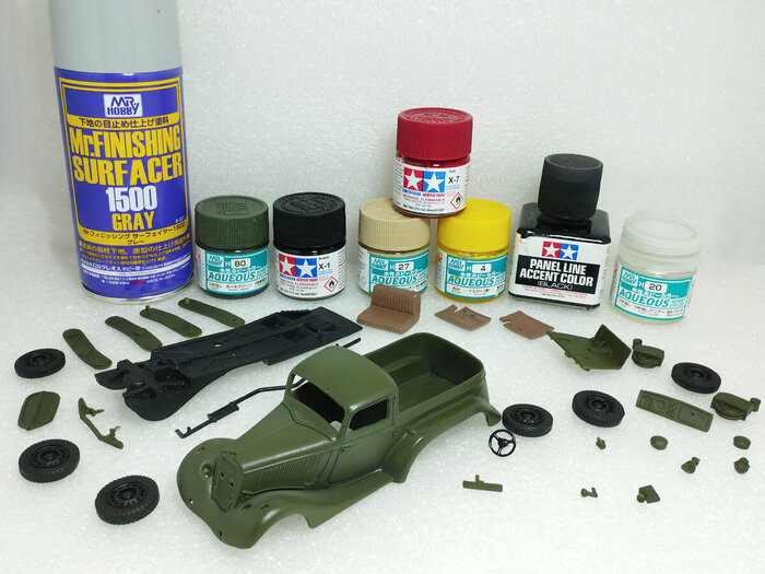 для кузова, элементов тележки, торпедо, переднего бампера и других навесных элементов я применил акриловую краску Н80 Khaki green (Mr.HOBBY);