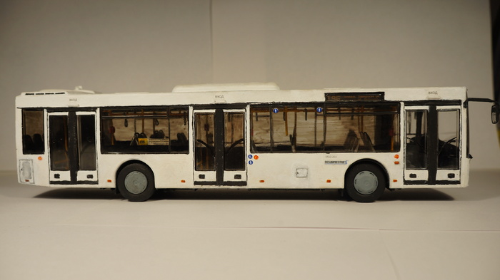 Всем привет! Вашему вниманию предстаёт масштабная модель городского автобуса МАЗ-203.085 в масштабе 1:43 от производителя AVD Models. Делал с перерывами около 5 месяцев (уже руки опускались его доделывать). Модель собиралась почти "из коробки" добавлялись только мелкие элементы в салон и на кузов. Прототип работает в Питере в 7 автобусном парке, сейчас ходит под номером 8414. Но модель чуть под другую модификацию и имеются отличия некоторые. Декали самодельные. В салон добавлены валидаторы и кнопки открытия дверей. А снаружи проводка к стеклоочистителям. Зеркала с зеркальным покрытием (шло в комплекте с китом). Также окна затонированы цветным лаком от Tamiya кистью (да, неправильно, но что есть...), чуть выделена расшивка (жидким акрилом)