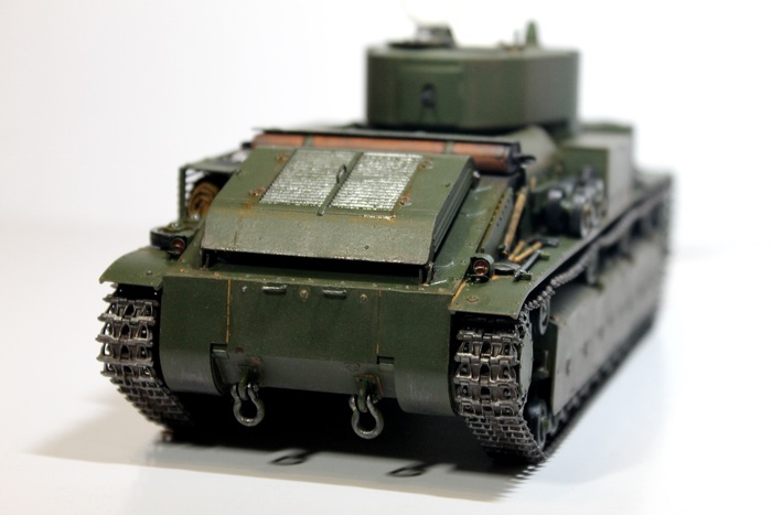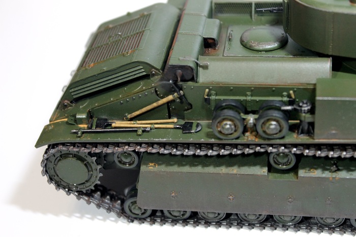 Работы по "корпусу". Убрал отливы и углубления под шанцевый инструмент. Убрал крепления задних баков и заново сделал болты. Убрал болты крепления печки. Обработал, собрал и установил катки от MSD, ну и пару родных катков. Установил кронштейны баков и запасные траки с имитацией крепежных болтов. Сплёл тросик из медной проволоки.