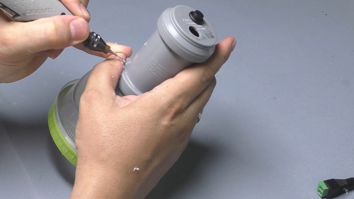 После соединения контейнера и корпуса необходимо проделать еще одно отверстие. Здесь мы будем выводить провод с крокодильчиком