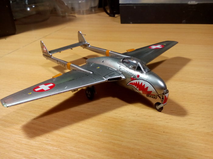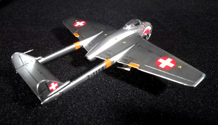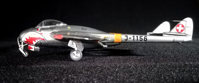 Представлена модель De Havilland DH.100 Vampire FB.Mk.6 с классическим коротким носом ВВС Швейцарии, аиабаза Эммен, 1966 год. Модель украинской фирмы Amodel, масштаб 1/72.