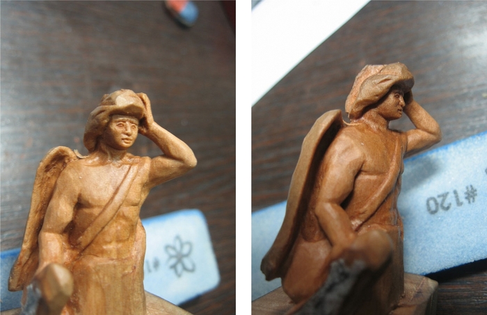 Но эта фигурка изготавливалась для себя. Она не предназначалась для готовой модели, и в дальнейшем и должна была жить отдельно, просто как отдельная скульптура. В те далекие времена, когда и шел процесс работы над этим ангелом, я планировал поездку в Питер, чтобы поучаствовать в Кубке Университетов. Так именуется один из российских форматов соревнований по стендовому судомоделизму. Такие тоже существуют, если кто не знал. И я вез на тот Кубок небольшую компашку из своих резных работ. И этот ангел должен был стать одним из экспонатов. Такая вот краткая предыстория.