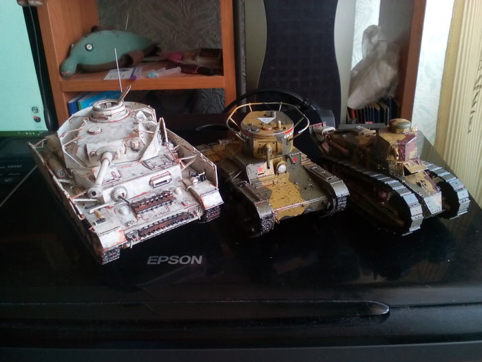 О создании: Сборка на обычный клей от "Звезды", гусеница паялась, клеилась цианоакрилатом и всем, чем можно. До покраски сделаны попытки создать следы попаданий пуль, осколков и снарядов. Также сделана имитация триплексов мехвода из прозрачного пластика. На фото сверху можно видеть, что стволик спаренного пулемёта серый - был взят из другого набора.