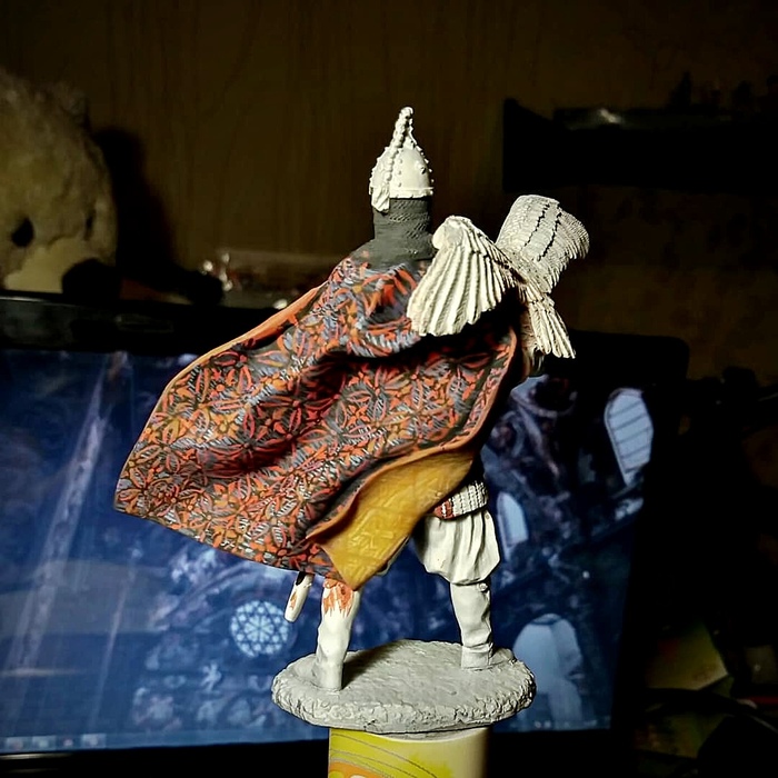 Опробовала много нового в росписи этой миниатюры. Самой сложной его частью для меня был Плащ - его геометрический подклад - я его раз пять перекрашивала, зато внешнюю часть плаща расписала почти без проблем)