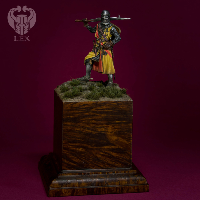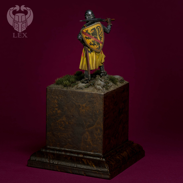 Здесь рыцарь изображен перед боем, потому что нам с заказчиком показалось маловероятным, что после боя уставший воин станет вальяжно забрасывать щит за спину, а гвизарму не менее вальяжно держать на плече.