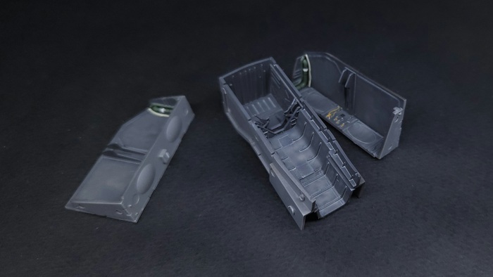 Традиционно любая сборка модели самолёта начинается с кабины. Сам набор предлагает очень ( ну ОЧЕНЬ) упрощённую кабину. Нет ни вменяемых кресел, ни пультов за креслами, ни шторок на фонаре, хотя фонарь на модели большущий. В моём же случае, улучшать ее нету времени, да и ТЗ заказчика этого не требует. Поэтому применил только сокращённый набор от QuintaStudio и катапультные кресла от TempModels.