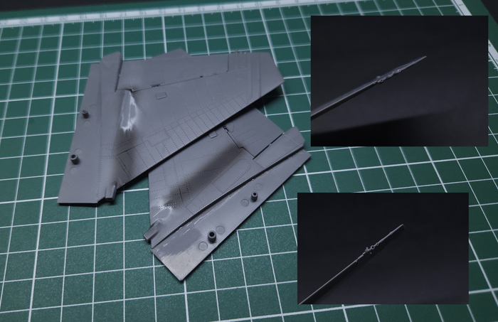 Консоли крыла. Тут типичное для KittyHawk странное членение на нижнее части консоли. Шов несложный, но неприятный. Тоже понадобилось раза 4 ещё шпатлевать, потому что после просушки шпатлёвки раз за азом появлялась небольшая усадка, которую проявлял грунт.