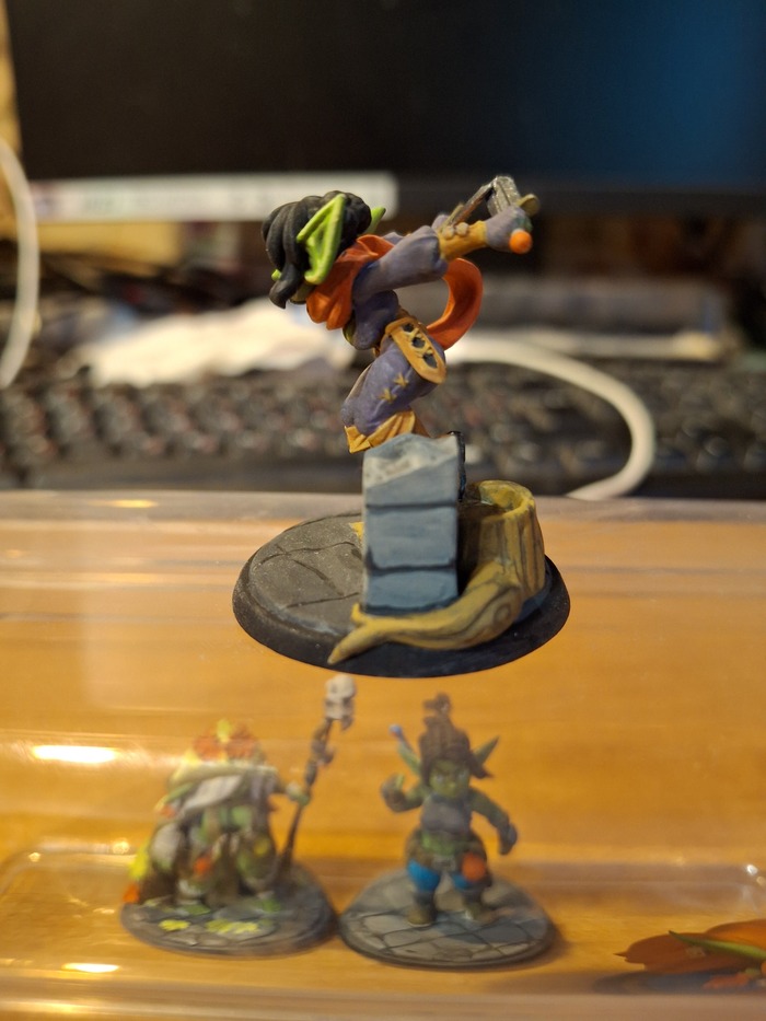 Базу красил сначала в базовый цвет, потом проливка(тут прям по всей поверхности), потом поверх еще слой базового цвета. Клеил на суперклей, почему-то специализированный модельный клей не захотел держать фигурку на подставке.