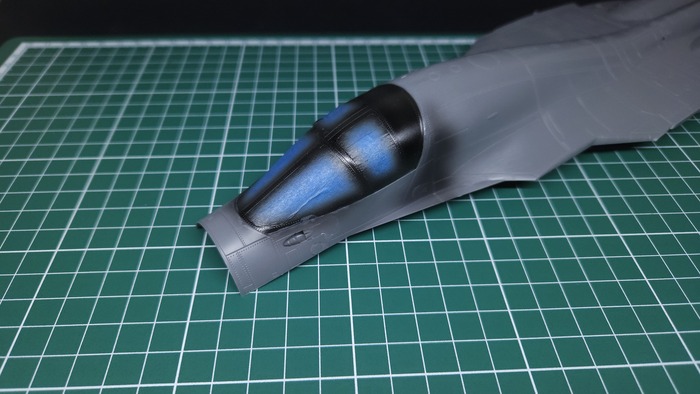 Воздухозаборники были собраны и установлены на свои места. Установку производил поэтапно с сильным давлением по местам склейки, чтобы избежать очень больших ступенек в местах сочленения с мотогондолами, которые у данного производителя являются нормой (по его мнению). Вышкурил их изначально, а затем нанёс двухкомпонентную шпатлёвку.