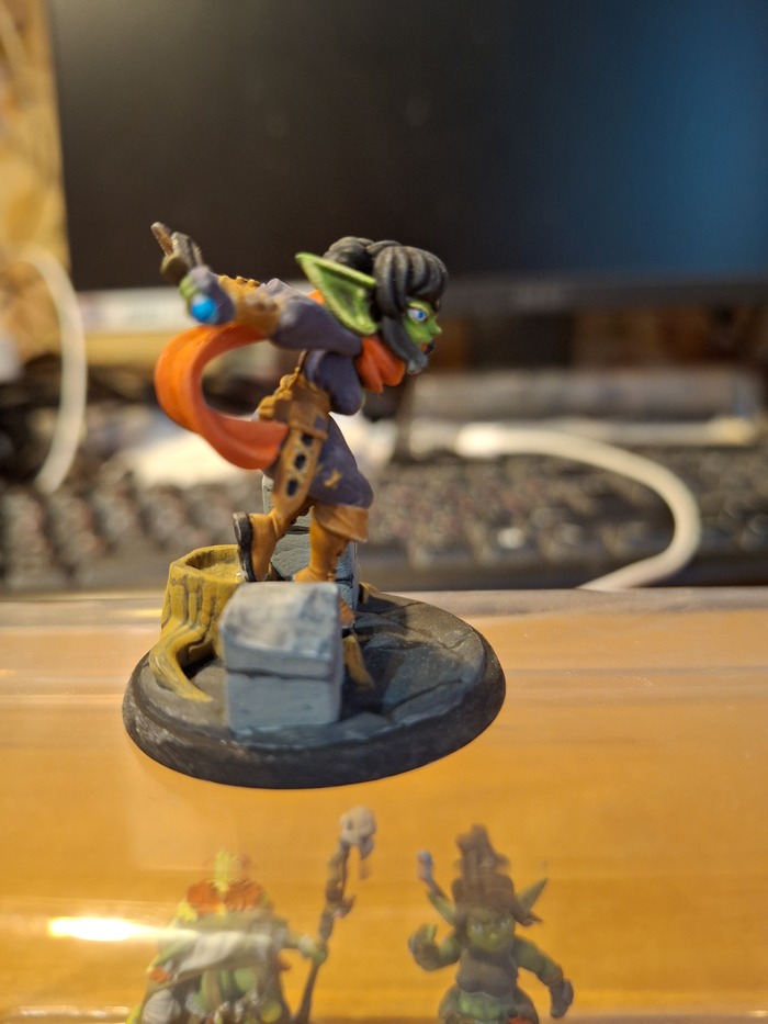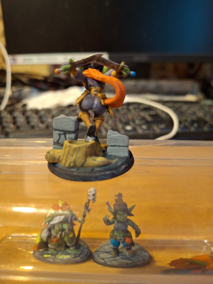 Завершение покраса гоблинши-разбойника. Волосы сделал в максимально простом виде - черный с высветлением тех мест, которые повыше. Кинжалы сначала покрасил черным, потом сверху - металликом, потом некоторые места проливкой(самопальным аналогом:-)).