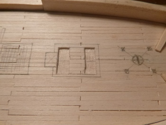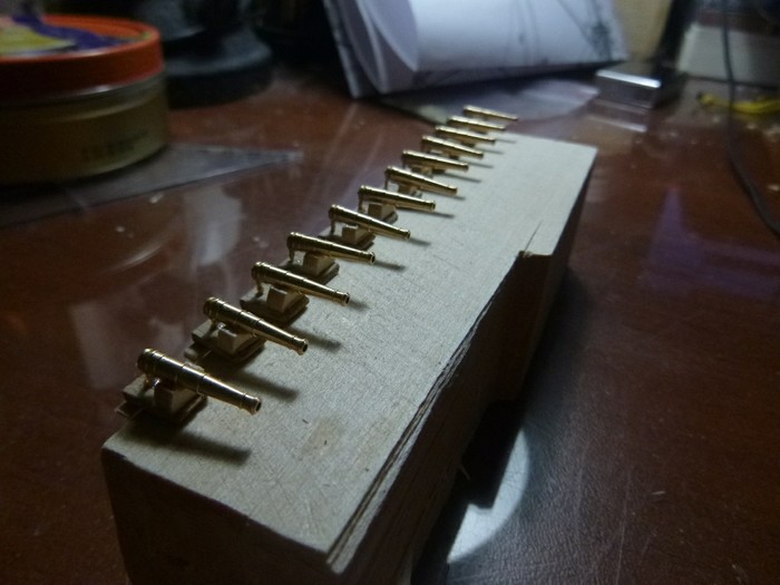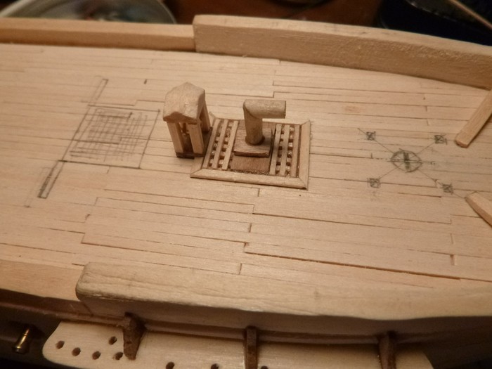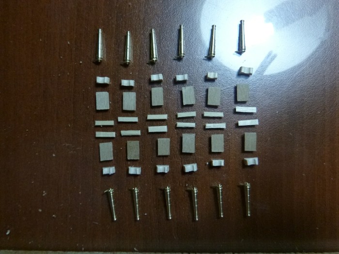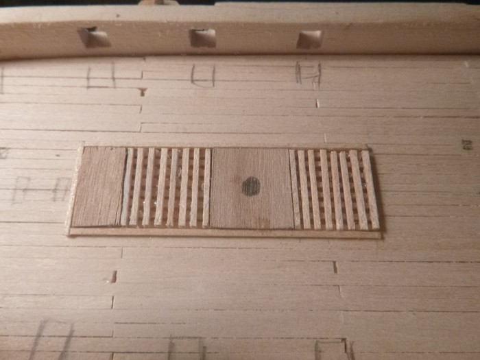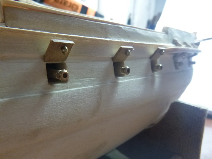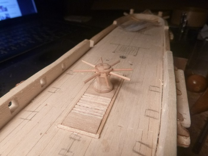 Помимо этого, в процессе покраски я добавил несколько новых вещей - коечные сетки по контуру фальшбортов, сделанные из таз же тонких реек, кафель-нагельные планки вокруг будущих мачт, и примерил первый уровень этих самых мачт.