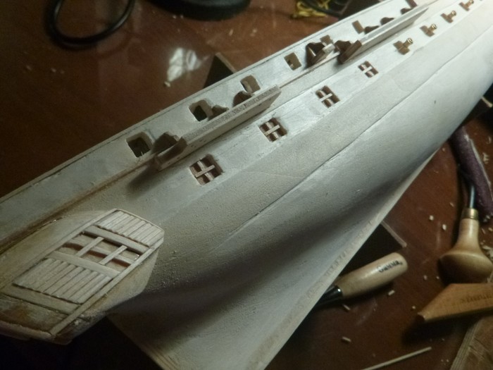 Далее - бархоуты и внешняя часть фальшборта были покрашены в черный, внутренняя часть фальшборта в тот же коричневый.
