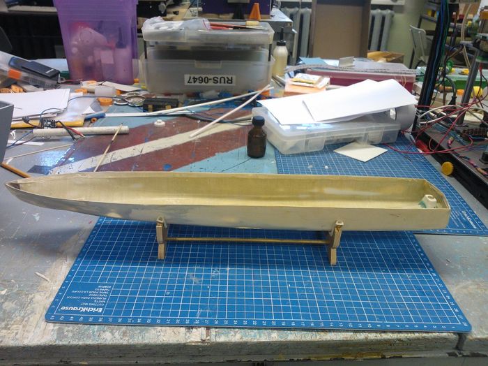 И только уже после покраски я клеил рейки вдоль бортов, чтобы пропитка их не задела. Так же, из латунной проволоки я сделал трап с обоих бортов.