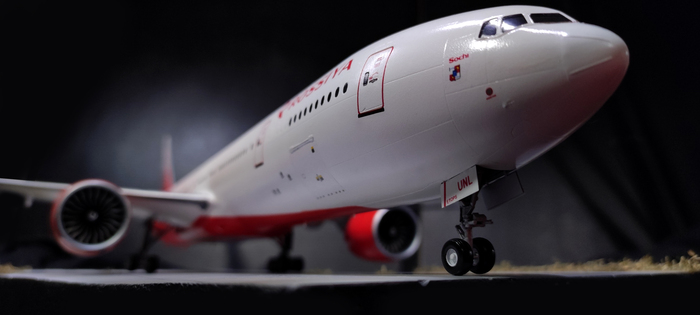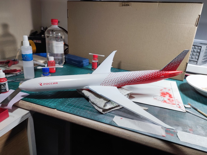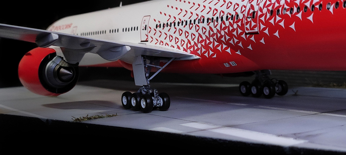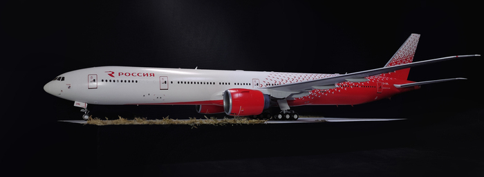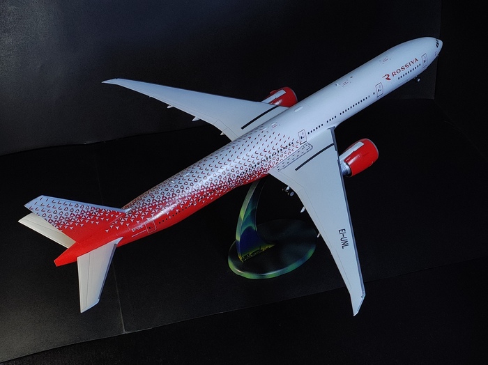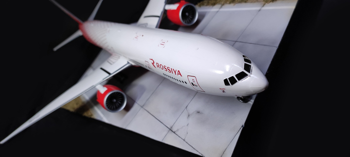 Попали мы туда не без помощи портвейна 777 Боинга 777 - большого красивого самолёта, в красно-белой ливрее авиакомпании Россия. Лететь восемь с небольшим часов, и моя жопа за время полёта успела породниться с этим лайнером и принять квадратную форму кресла. Обратно летели тем же самолётом, и за 16 часов тесных отношений я успел к нему прикипеть, да и к тому же впечатления о поездке были свежи... И вот я, воюя с тараканами на пересадке в каком-то хостеле в Москве, уже импульсивно заказываю модель, дополнение и декали в нужной расцветке. О, декали... Вся боль этой сройки была именно от них. Чтобы меня не обвинили в антирекламе, допустим, назовём фирму, что их делает "Pidaras-decals". И перейдём уже непосредственно к модели, а то вступление затянулось.