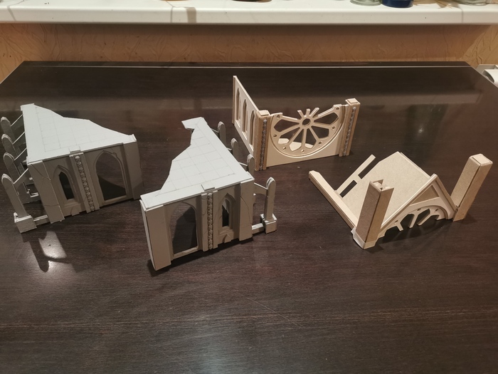 Попробую постить сюда контент иного рода. Картонные руины. Картон 2мм и 1мм, ПВА, серый грунт. Элементы декора отпечатаны на 3d принтере. Режу картон пока вручную, но уже наделал векторных файлов для заказа лазерной резки.