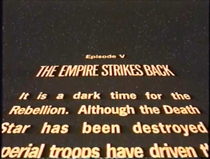Году в 94м в видеозале (помещение с приглушённым светом, по центру которого стоял телевизор с видеомагнитофоном) подмосковного дома отдыха показывали "Эпизод 5: Империя наносит ответный удар". Почему-то именно вторую часть из трилогии. При этом предыдущую и последующую части не показывали. На тот момент для меня это было не так важно, я был бы не против, если вообще весь фильм только летали звездолёты и стреляли из бластеров.