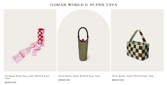 На этой неделе Gohar World выпустили свой следующий набор необычных стильных сумок в сотрудничестве с Super Yaya (бренд ливанской художницы и дизайнера Рим Бейдун). Два предмета коллекции посвящены исключительно цветам: первый — исключительно для больших букетов, которые можно подарить на праздник; второй, для небольшой букетов, которые можно купить магазине и поставить дома в маленькую вазу. Так же в коллекцию вошли сумка для бутылок с вином и красочная корзина для пикника. «Все они хорошо вписываются в нашу вселенную», — говорит Лейла.