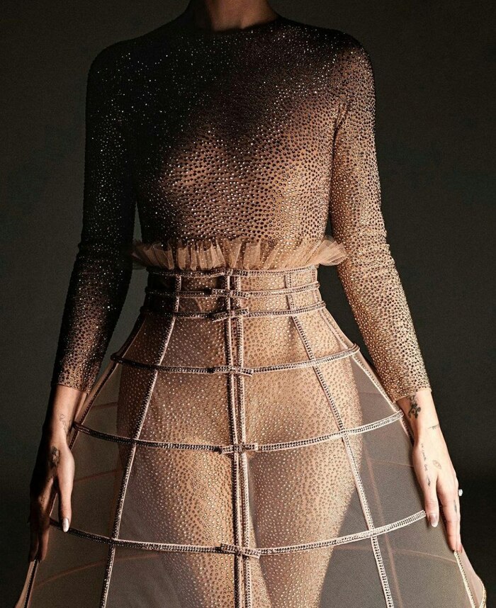 Как сказала сама Мария Грация Кьюри, в основе создания этого платья лежит работа художницы Яны Стербак, которая еще в 1989 году показала юбку-клетку, надев которую, телом могли управлялять дистанционно.