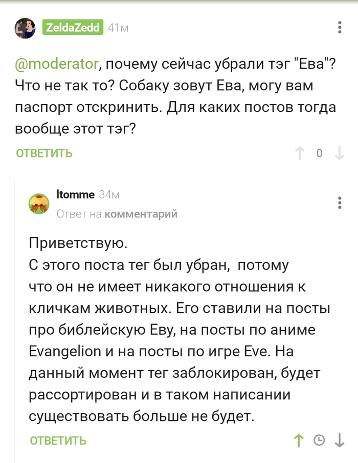 Я пишу пост, вижу тэг "Ева" и ставлю его. А потом тэг убирают, ибо этот тэг оказывается, только для библейской Евы и какой-то компьютерной игры🤷♀️.