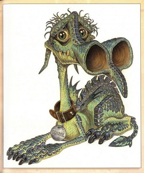 «Из теней стремительно вынырнула фигура капитана Ваймса. Под мышкой он держал маленького и чрезвычайно испуганного золотистого дракончика. Другой рукой капитан придерживал героя за хвост.