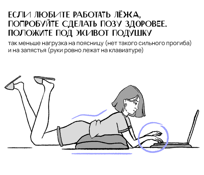 Постепенно сокращайте время пребывания в такой позе до 15 минут. Когда человек долго работает лёжа на животе, у него развивается туннельный синдром, при котором болят запястья и немеют пальцы, а через пару часов начинают болеть голова, шея и поясница. Всё потому, что позвоночник находится в неестественном положении — голова запрокинута, поясница прогнута.