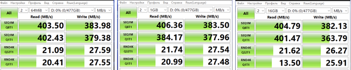 порядка 400 МБ/с для HDD 2.5″. Это старенький 2 Тб твердотельный диск, снятый с ноутбука. Вполне себе живой и шустрый, по стоимости выходит практически вдвое дороже 3.5-дюймового, если пересчитывать на единицу ёмкости.