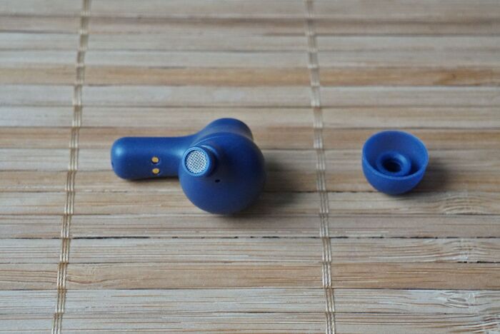 Сами наушники сделаны из аналогичного пластика, что и зарядный чехол и имеют классическую форму и эргономичный дизайн. Они отлично держаться в ушах и не выскакивают в условиях активных тренировок. Отмечу, что степень влагозащиты ушек IPX5 позволяет их использовать, в том числе под дождем.