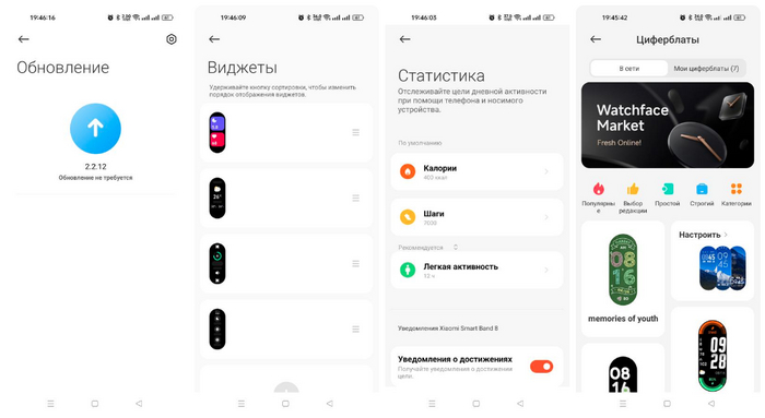 Все настройки фитнес браслетов осуществляется в окне устройства. Здесь можно просмотреть статистику по часам, произвести синхронизацию, обновление, настроить уведомления и другие действия. В принципе настройки не вызывают сложности, потому как всё на русском языке и интуитивно понятно.