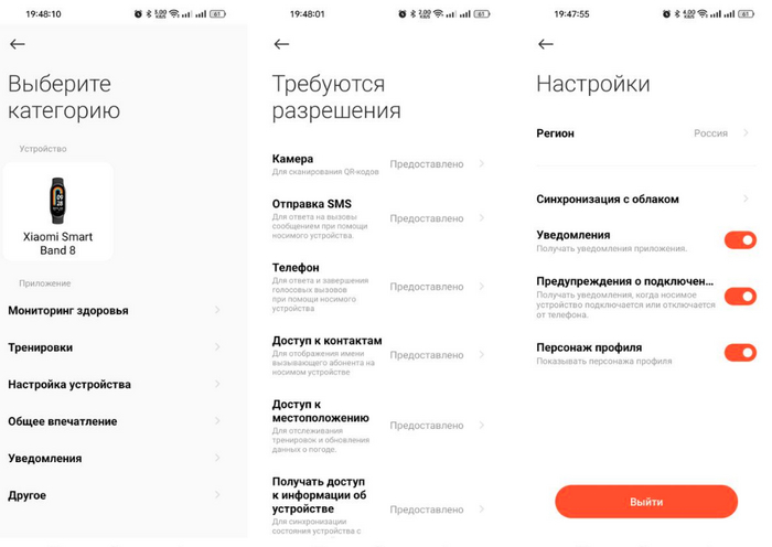 Мобильное приложение MiFitness после подключения гаджета разделяется на четыре окна: здоровье, тренировка, устройство, профиль.