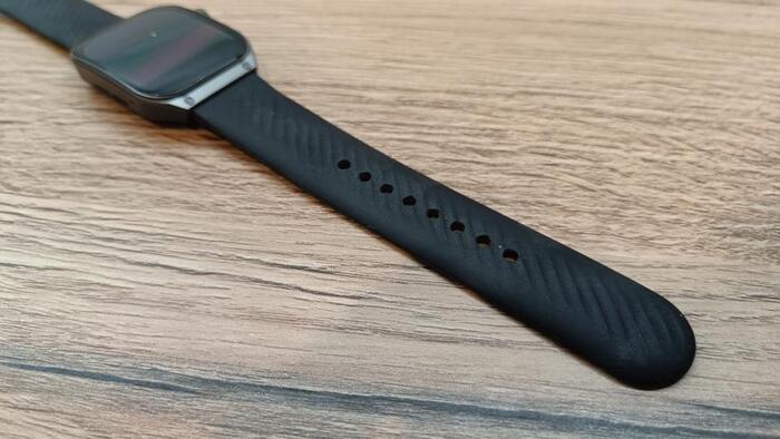 Ремешок выполнен из мягкой резины, имеет посадочный размер в 22 мм с быстросъемными карабинами. Удобно заменить в случае необходимости или смены стиля. На самом ремешке уже пресутсвуют отверстия для плавной регулировки и металлическая клипса для фиксации.