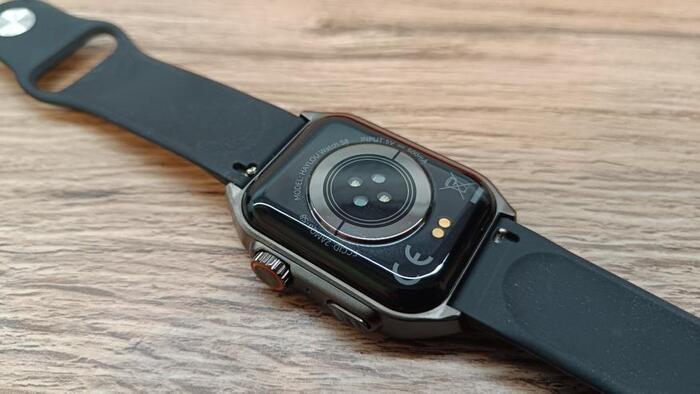 На тыльной стороне часов установлены датчики снимающие показания. Тыльная крышка глянцевая и выполнена, скорее всего, из поликарбоната.