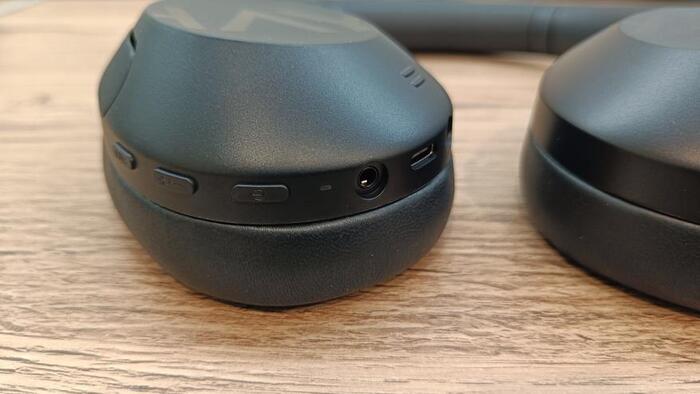 Если по порядку, то: отверстие дополнительного микрофона, разъём подключения выносного микрофона, разъём USB type-c, разъём подключения mini jack 3,5 кабель AUX, светодиодный индикатор режима работы, три кнопки управления с пиктограммами. Необычная особенность при подключении выносного микрофона. На наушниках присутствует необычная стрелка, а само углубление овальной формы. Поэтому при установке выносного микрофон нужно это учитывать.